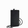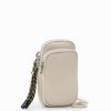 Uma bolsa de smartphone de efeito de couro com uma tira, fechamento de zíper e vários bolsos. Logo