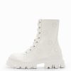 Botas de estilo militar muito alto com um tecido de efeito de couro grosso, com mensagens contrastantes e uma fixação de renda.