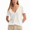 Uma camiseta de tule de manga curta com colarinho de lapela, botões e uma impressão em aquarela-efeito. Tule