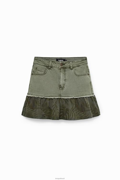 Fluxo de retalhos com uma impressão tropical representando plantas e chitas em uma minissaia jeans em tons verdes com acabamento de corte cru. Feito de sarja de algodão sustentável cáqui com flounces tencel.
