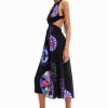 Um vestido curto, ajustado e sem mangas em malha nervosa com diamantes contrastantes, um pescoço de cabeceira e uma saia A-line. Efeito