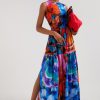 Um vestido midi com tiras com botões e painéis coletados em tecido de algodão com bordado suíço. Fechamento